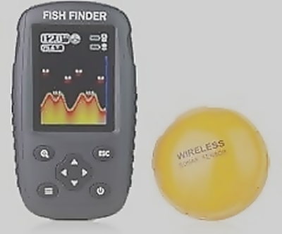 Portable rechargeable fish finder with wireless sonar sensor, detects fish size and bottom contour.