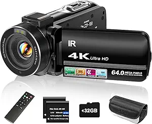 The ZYDIIE 4K Video Camera Camcorder is a high-performance UHD camera designed for vlogging and capturing stunning videos for YouTube. Featuring a remarkable 64MP resolution and 18x digital zoom, this camcorder allows you to capture detailed footage with ease. The 3-inch IPS touchscreen rotates 270°, providing flexibility in framing your shots. It also includes advanced night vision capabilities, making it suitable for low-light conditions. The package comes complete with a remote control for easy operation, a 32GB memory card for storage, and two batteries to ensure you never miss a moment.